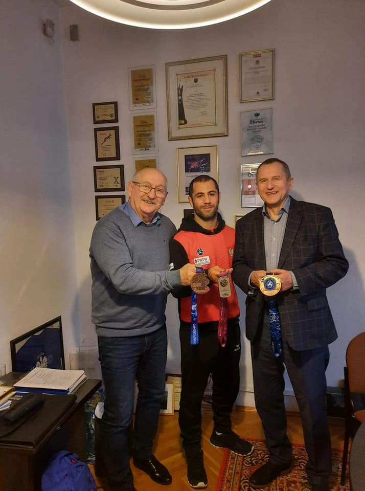 Rozbrzmiewa jeszcze echo sukcesu Gevorga Sahakyan na Mistrzostwach świata w Oslo. Jego brązowy medal sprawił wielu osobom dużo satysfakcji. Niewątpliwie jedną z nich jest wieloletni przyjaciel kartuskich zapasów – Pan Jan Koszałka, prezes PHU Koszałka. Pan Jan jest jedną z osób najdłużej współpracująca z sekcją zapaśniczą GKS Cartusia Kartuzy. Śmiało można powiedzieć, że jakaś część sukcesu jest także jego autorstwa. Więc cóż mógł zrobić nasz mistrz ? Po prostu podziękować, podzielić się wrażeniami i zrobić pamiątkowe fotografie. Jak zawsze w tej firmie wszyscy z uśmiechem, sympatyczni, widać, że sukces wszystkim przypadł do gustu. Tą drogą zawodnik i trenerzy składają serdeczne podziękowania. Mamy nadzieję, że jednym z medali, które zaprezentujemy w przyszłości będzie medal olimpijski z Paryża.