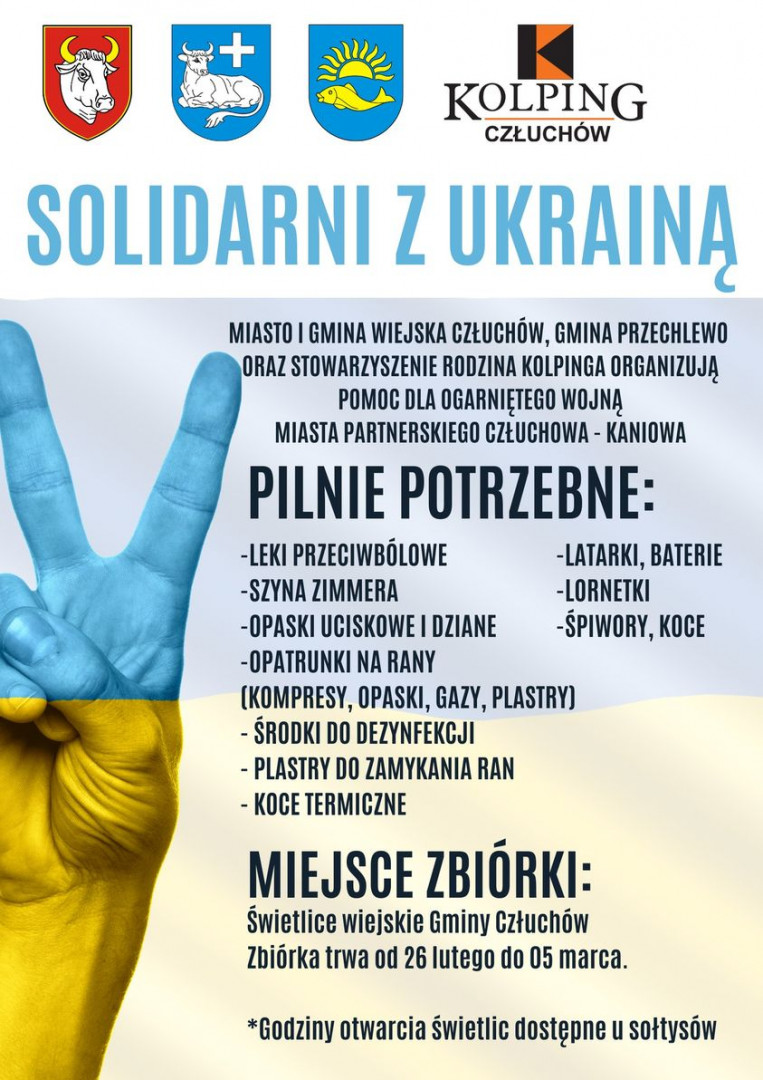 Z informacji, którą podaje oficjalna strona internetowa Gmina Człuchów w terminie od 26 lutego do 05 marca trwa zbiórka najpotrzebniejszych środków pomocy dla mieszkańców Ukrainy. W swoim artykule strona pisze: